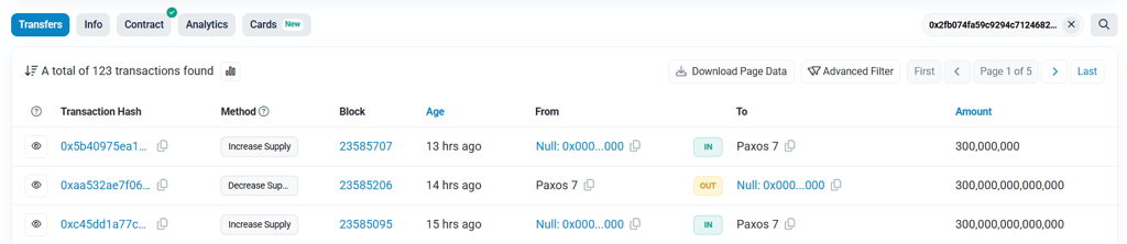 It looks like Paxos had the intention to mint 300 million PYUSD rather than 300 trillion, as 2 hours later the on-chain data showed a new transaction where Paxos mint 300 million PYUSD.