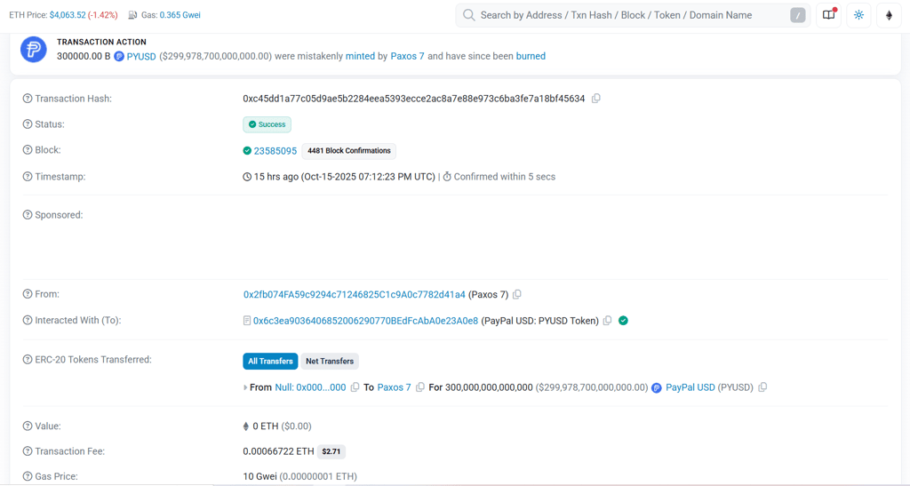 The event occurred on 15 October 2025, when Paxos, as the issuer for PayPal Holdings Inc. PYUSD, minted a huge amount that could potentially wipe out the entire global debt, printing a staggering 300 trillion PYUSD out of thin air, which is equivalent to $300 trillion since 1 PYUSD equals $1. This Paxos event can be seen on-chain on Ethereum blockchain with transaction hash 0xc45dd1a77c05d9ae5b2284eea5393ecce2ac8a7e88e973c6b a3fe7a18bf45634.